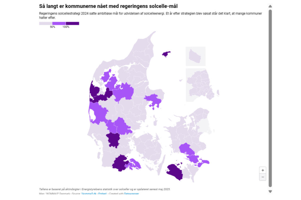 Det nationale billede viser, at Danmark på nuværende tidspunkt kun har opnået ca. 4,3 GW ud af de nødvendige 20 GW solcellekapacitet. Det svarer til omkring 22 % af det samlede mål.