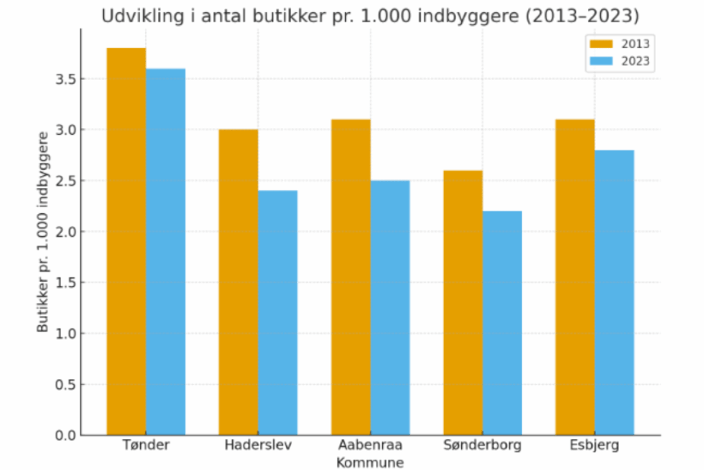 I modsætning til flere af nabokommunerne har Tønder Kommune klaret sig bedre. Her er antallet af butikker kun faldet fra 3,8 til 3,6 pr. 1.000 indbyggere fra 2013 til 2023 – et fald på blot 3,9 %. Til sammenligning har Aabenraa oplevet et fald på hele 18,4 %, Haderslev 17,8 % og Sønderborg 14,8 %.