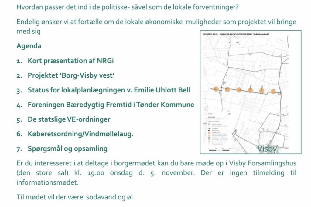 VE-projektudviklere fra NRGi fra Aarhus inviterer borgere i Visby og omegn til informationsmøde om de vindmøller i projekt 5A, der er ansøgt opstillet i Tønder Kommune. Formålet er at give et tidligt indblik i projektet, processen og de mulige påvirkninger af lokalområdet samt at svare på spørgsmål fra borgerne.