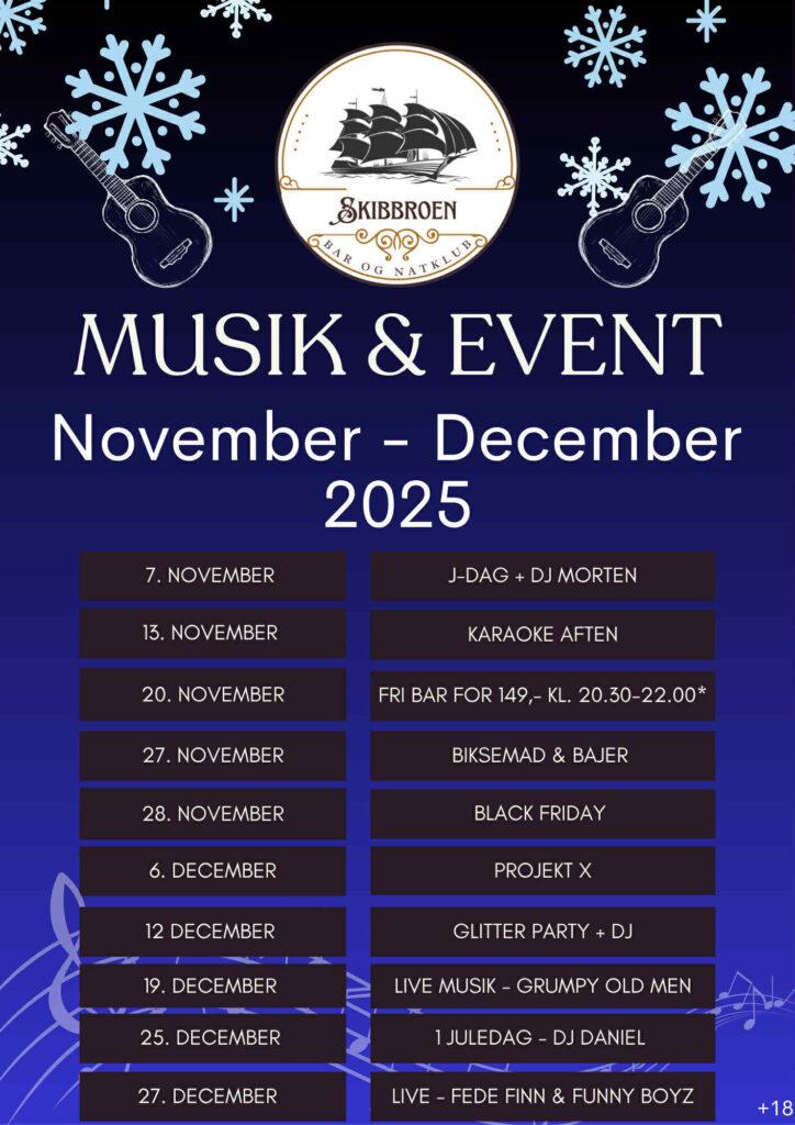 Programmet skydes i gang 7. november, hvor Skibbroen markerer J-dag med DJ Morten bag pulten – en klassisk aften med julebryg, musik og dansegulv.