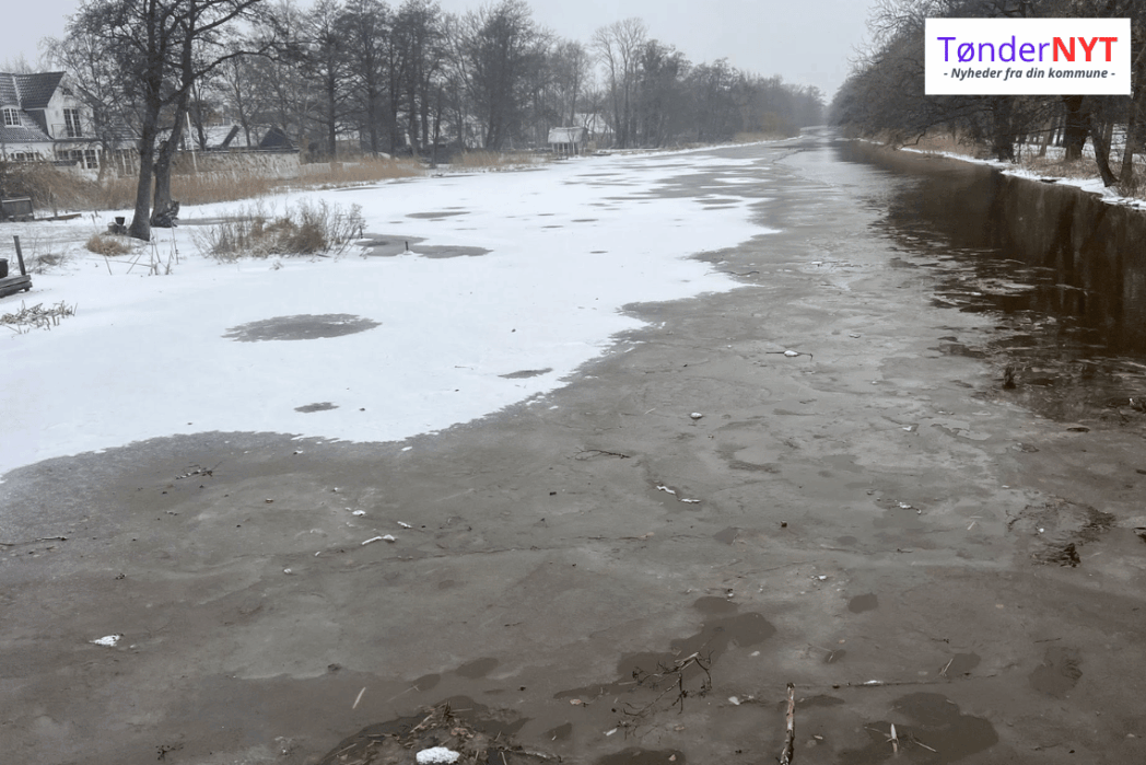 Hvis man tager en gåtur langs Kongevej i Tønder, er det tydeligt at se, hvor hårdt vinteren har ramt. Torsdag eftermiddag var store dele af Vidåen frosset til, og kun et smalt bælte midt i åen var stadig åbent, så vandet kunne passere. Ved Mølledammen, hvor Vidåen passerer ud til Bachmanns Mølle, er situationen den samme; her er kanterne frosset så kraftigt til, at der næsten intet vand løber over overløbet.